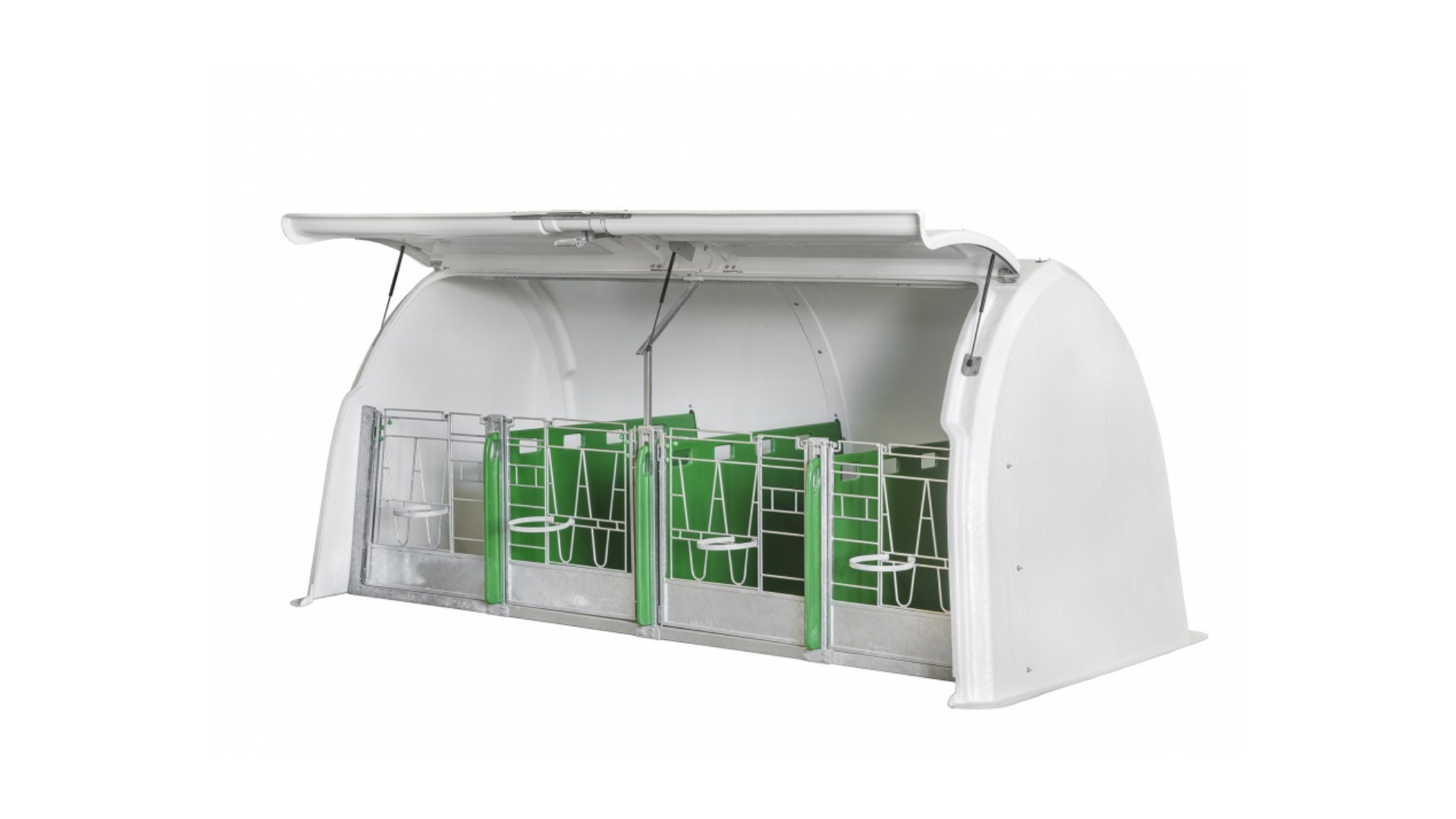 - Configuration flexible: il est possible d’élever jusqu’à quatre veaux dans une même niche, en logement individuel ou collectif, sans les déplacer ou les mélanger avec d’autres veaux. Les cloisons amovibles permettent différentes configurations: 4 x 1, 2 x 2, 1 x 4 (ou 1 x 3 et 1 x 1).