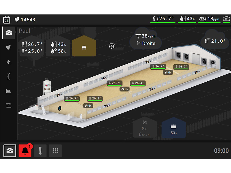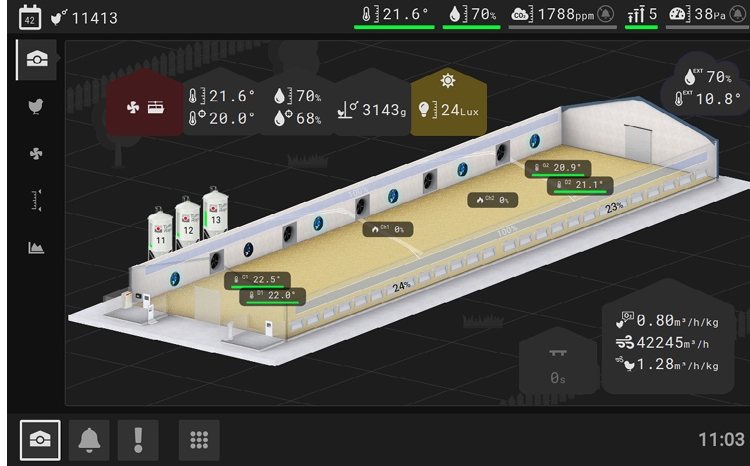 Senzori: senzor de temperatură interioară ×20, senzor de temperatură exterioară, senzor CO₂, senzor NH₃ (amoniac), senzor de umiditate, senzor de umiditate exterior (inclus), senzor de vacuum (presiune statică), senzor de iluminare ×2, termostat ×10, întrerupător crepuscular.